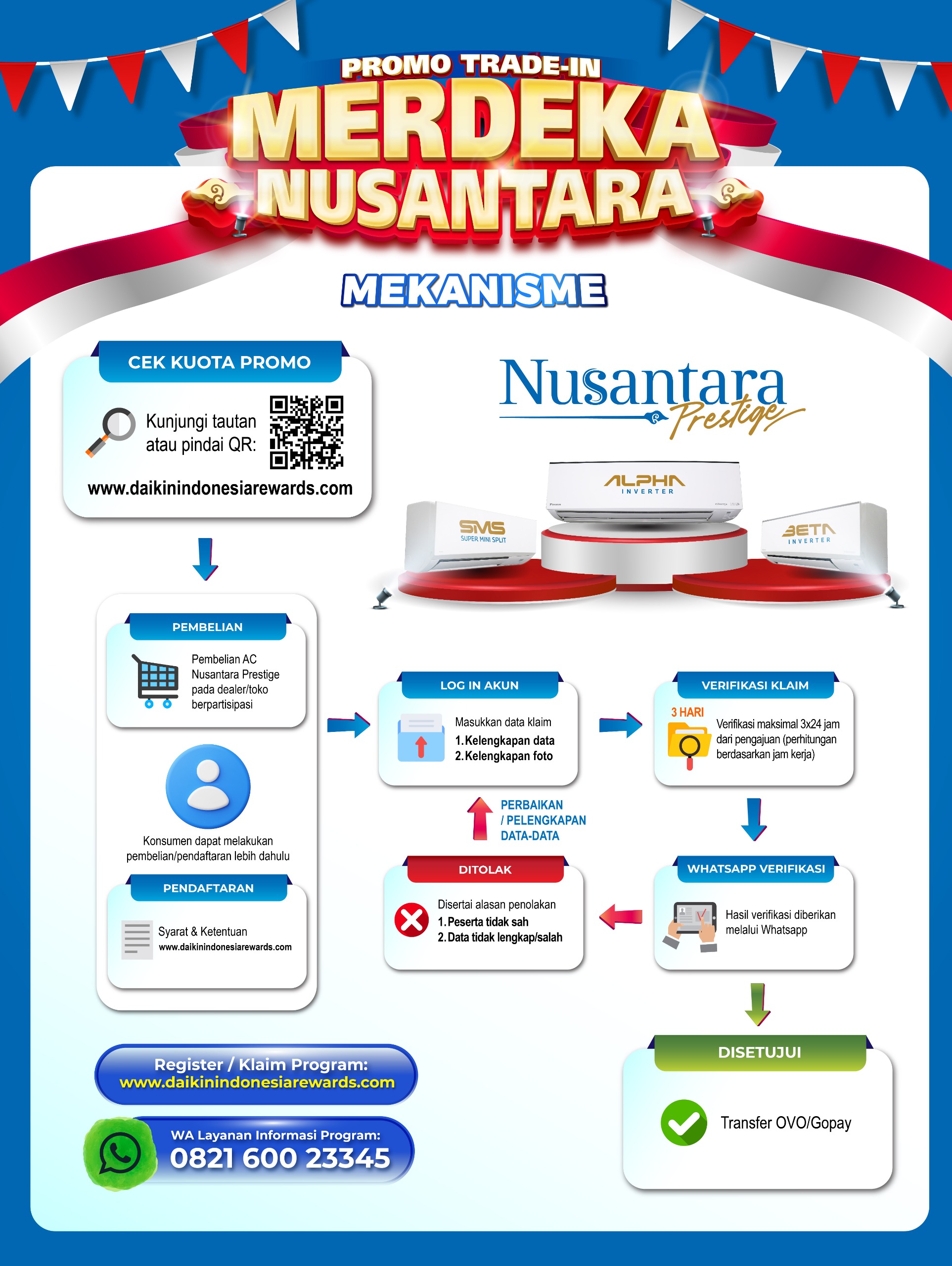 - Konsumen dapat melakukan pengajuan trade-in AC lama tanpa batasan merek, model maupun kapasitas pendinginan dengan pembelian salah satu model AC Nusantara Prestige DAIKIN - ALPHA Inverter, BETA Inverter, Super Mini Split - selama periode promosi berlangsung di seluruh toko yang berpartisipasi dalam program ini.